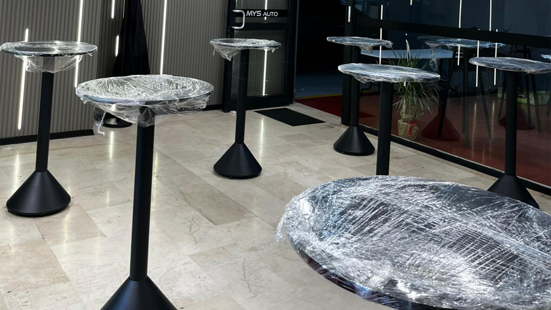 Bistro Masa: Modern tasarımı ile şıklığı ve işlevselliği birleştiren bu masalar, misafirlerin ayakta rahatça vakit geçirmesi için ideal bir alan sundu. Yüksekliği ve zarif görünümüyle mekana sofistike bir hava kattı. Bu masalar, açılışın sosyal ve estetik açıdan daha etkileyici olmasını sağladı.